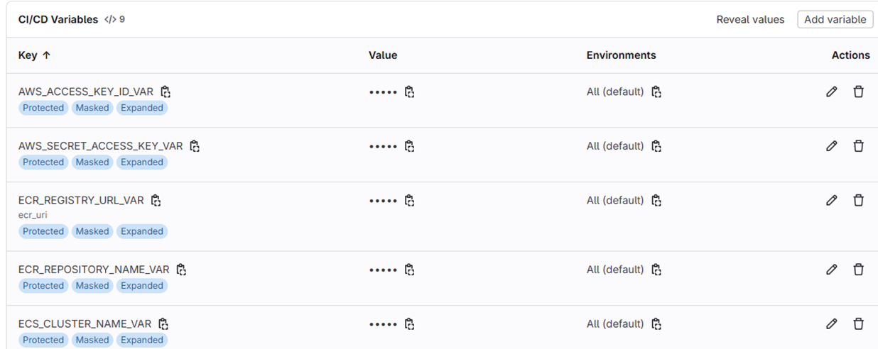 파이프라인이 실행될 때, AWS에 접근하기 위한 자격 증명(Access Key)이나 ECR 주소 같은 민감하거나 자주 바뀌는 정보들이 필요합니다. 이런 정보들을 .gitlab-ci.yml 파일에 직접 하드코딩하는 것은 보안상 매우 위험합니다.